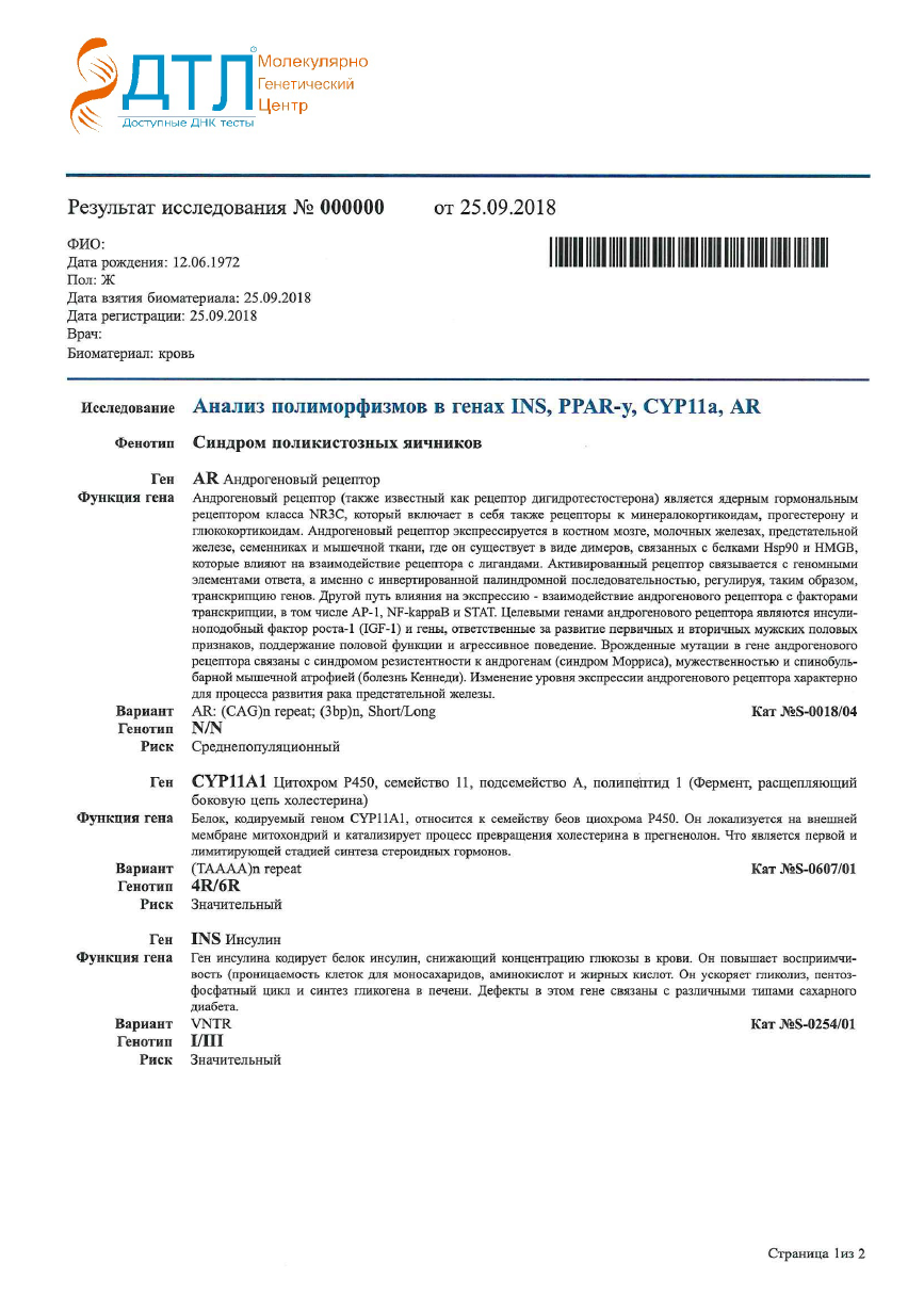 Маркер (CAG)n, вариант L, где число повторов более 22. Указывает на пониженную чувствительность к гормонам андрогенам. Данная мутация приводит к повышенному производству тестостерона и увеличивает риски развития синдрома поликистозных яичников.
