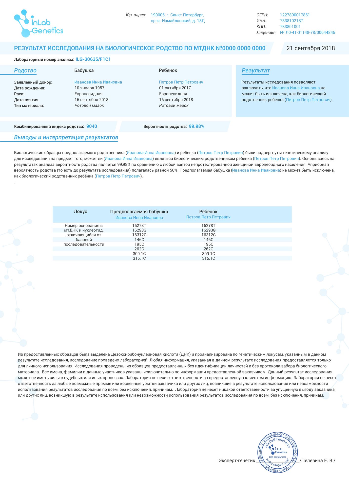 Точность метода достигает 99,999999%. Для независимого контроля проводятся параллельно два теста разными группами специалистов. Затем результаты заверяются подписью заведующего лабораторией и печатью.